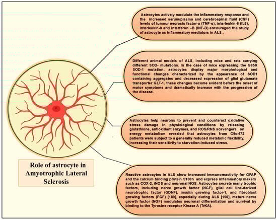 In most of cases the etiology of amyotrophic lateral sclerosis (ALS), a neurodegenerative illness that affects both the CNS’s upper and lower motor neurons is unknown. The illness often first manifests in midlife and causes gradual muscular paralysis, with a two-to-five-year survival rate. The gradual degradation of motor neurons in the brain stem, spinal cord, and motor cortex is a hallmark of amyotrophic lateral sclerosis (ALS). Although the exact chemical mechanism behind the gradual degeneration of motor neurons is unknown, it involves a process that is not cell autonomous. Astrogliosis is a reactive phenotype that astrocytes take on in response to acute injury or degenerative illnesses. The intricate reorganization of astrocyte biology known as astrogliosis reflects a range of possible phenotypes that impact neuronal survival and function in a way that is injury-specific. Reactive astrocytes are a major contributor to the pathophysiology of ALS patients, encircling both upper and lower degenerating motor neurons. Astrocytes are a key player in the pathophysiology of ALS. Astrocytes can affect the fate of motor neurons and the course of the disease by causing a loss of normal function or the acquisition of new traits. ALS-astrocytes can cause motor neuron death by secreting soluble substances or factors, according to the usage of several cell culture models. Since astrocytes are essential to the pathophysiology of ALS, treatments that alter astrocyte biology may aid in the creation of comprehensive therapeutic strategies to stop the disease’s progression [126] (Figure 9).