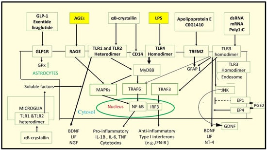 Most people know GLP-1 as a hormone that comes from cells in the intestines and makes pancreatic β cells make and release insulin. GLP-1 may easily pass the blood–brain barrier, and CNS cells can also make it. GLP-1 has been shown to have neuroimmunomodulatory actions that affect the brain cells’ metabolism. GLP-1 receptors (GLP1R) are found in astrocytes in humans, mice, and rats. GLP-1 stops LPS-stimulated cultured rat astrocytes from releasing IL-1β, while liraglutide, a GLP-1 mimic, stops cultured rat astrocytes that have been exposed to advanced glycation end products (AGEs) from releasing IL-1β and TNF [143]. Exenatide, a GLP1R agonist, increases the amount of glutathione peroxidase in human astrocytes, which makes them better at fighting free radicals [142,143,144]. GLP1R agonists can prevent the conversion of murine astrocytes to the A1 phenotype, which is brought on by microglia stimulated with α-synuclein fibrils, in addition to inhibiting proinflammatory activation of murine microglia and inducing their production of nerve growth factor (NGF) [145] and brain-derived neurotrophic factor (BDNF) [146,147]. In addition to being licensed for the treatment of type 2 diabetes mellitus, GLP-1 receptor agonists with extended biological half-lives have demonstrated encouraging protective benefits in preclinical animal models and the early clinical trials of AD and PD. The positive effects of GLP1R agonists on astrocytes may account for some of their neuroprotective properties [148].