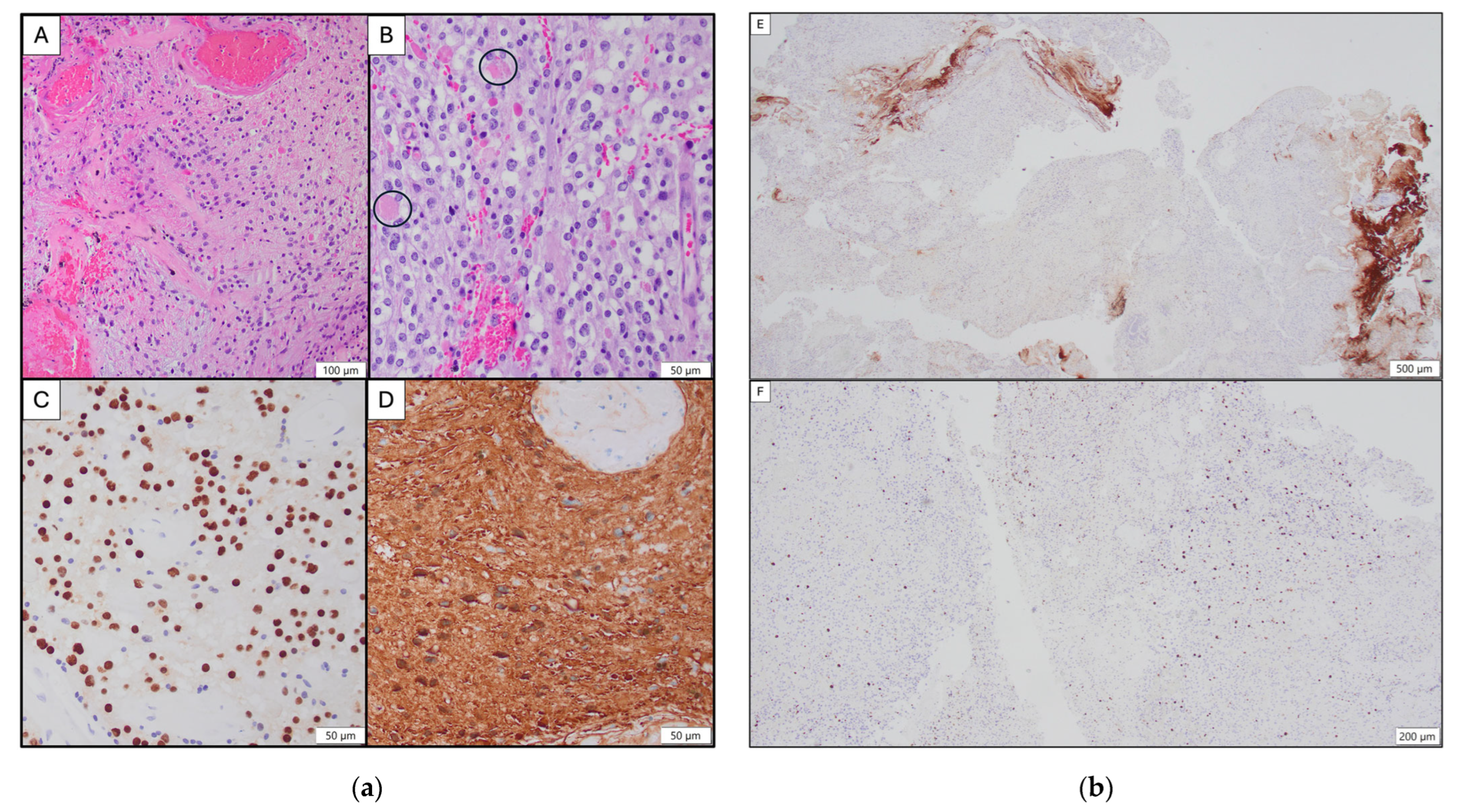 - Sahm, F.; Brandner, S.; Bertero, L.; Capper, D.; French, P.J.; Figarella-Branger, D.; Giangaspero, F.; Haberler, C.; Hegi, M.E.; Kristensen, B.W.; et al. Molecular diagnostic tools for the World Health Organization (WHO) 2021 classification of gliomas, glioneuronal and neuronal tumors; an EANO guideline. Neuro Oncol. 2023, 25, 1731–1749. [Google Scholar] [CrossRef]