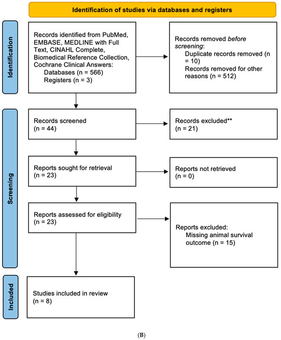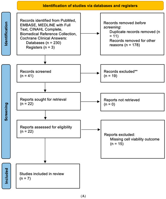 PRISMA flow diagram for systematic reviews for in vitro (A) and in vivo (B) studies. ** records were excluded based on relevance as screened by two independent reviewers.