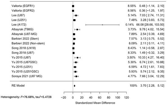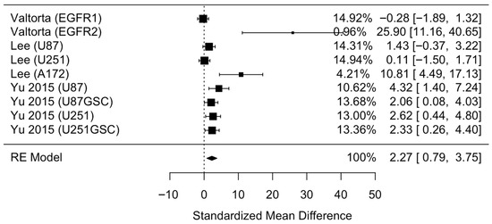 Standardized mean difference between standard therapy plus metformin and standard therapy alone in GBM cell viability using a random-effects model [21,22,26].