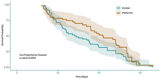 Pooled survival curve of in vivo studies in mice treated with metformin compared to no treatment.