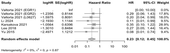 A subset of the in vitro (n = 3) and in vivo (n = 5) studies reported the effects of the use of metformin as an adjuvant therapy compared to traditional chemotherapy agents such as TMZ. Many in vitro studies demonstrated decreased cell viability, with the overall random-effects model also showing a significant reduction (SMD [CI]; 2.27 [0.79, 3.75]) (Figure 5). Mice treated with metformin in addition to standard therapies showed improved survival rates in several in vivo studies. The overall random-effects model demonstrated significantly improved mortality in the groups where metformin was used as an adjuvant (HR [CI], 0.23 [0.12, 0.45]) (Figure 6).