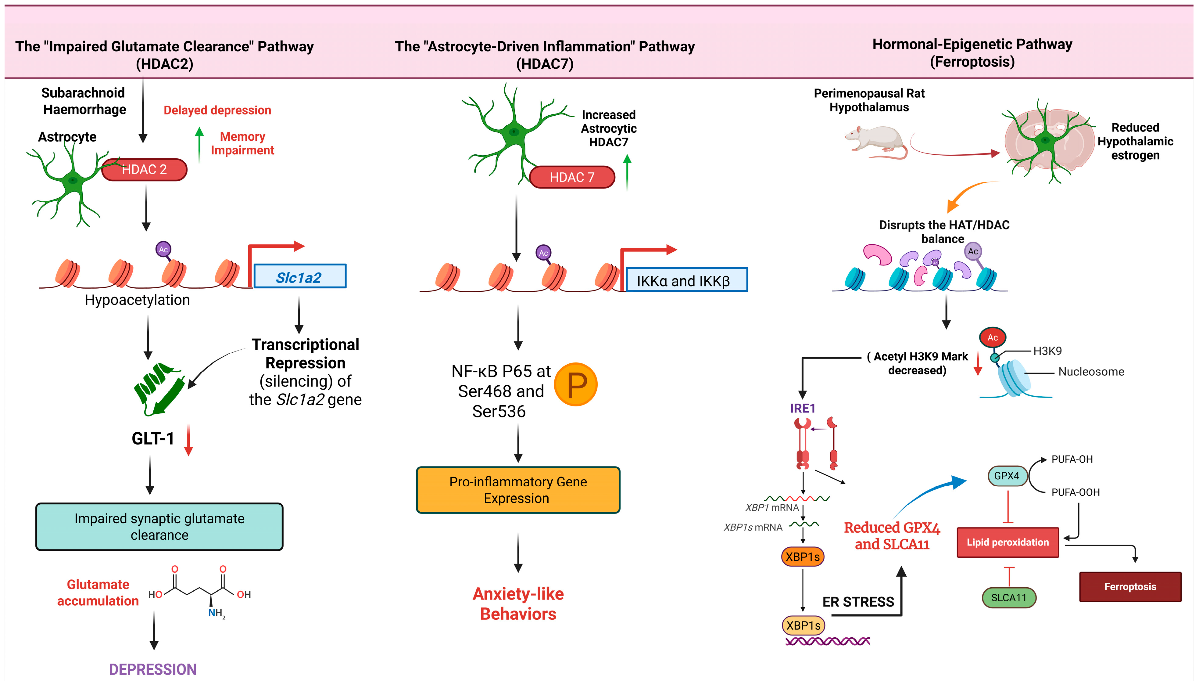 Figure 1. Key Epigenetic Pathways of Astrocytic Dysfunction in Depression and Related Disorders. Epigenetic dysregulation in astrocytes contributes to pathology through several key pathways. First, upregulated astrocytic HDAC2 can cause histone hypoacetylation at the Slc1a2 gene promoter, repressing its transcription. This reduces the GLT-1 glutamate transporter, leading to impaired glutamate clearance and depressive behaviors. Second, elevated astrocytic HDAC7 can activate the IKK complex, which triggers the NF-κB signaling pathway, driving pro-inflammatory gene expression and anxiety. Finally, hormonal shifts like reduced estrogen in perimenopausal state can disrupt the HAT/HDAC balance, decreasing the activating acetyl-H3K9 mark. This epigenetic change initiates ER stress via the IRE1/XBP1 pathway and downregulates antioxidant proteins (GPX4, SLC7A11), ultimately causing astrocytic ferroptosis. Green upward arrows represent upregulation whereas red downward arrows represent downregulation.