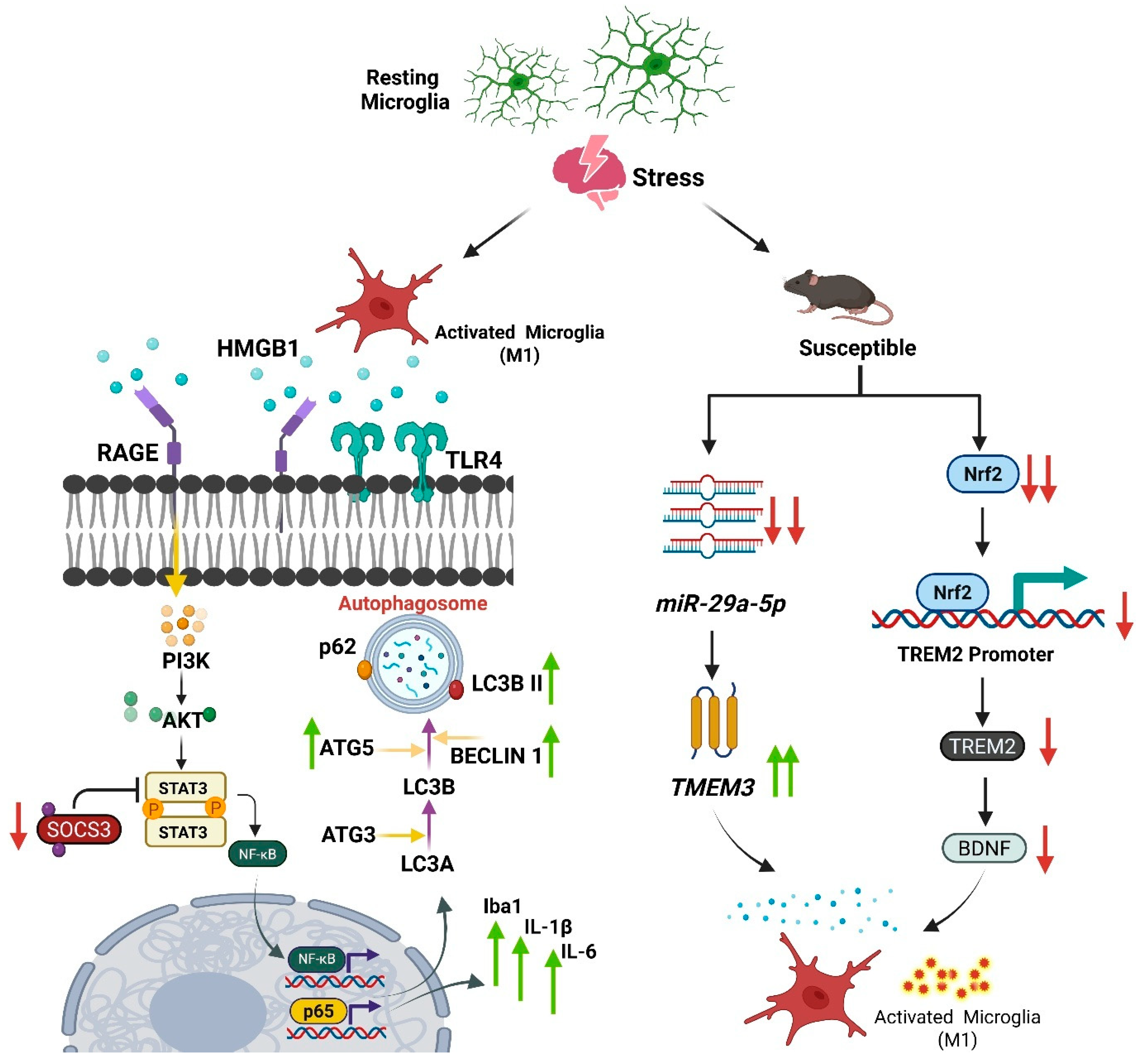 Figure 2. Key transcriptional pathways in mPFC microglia that regulate stress susceptibility and resilience. Stress induces pro-inflammatory, pro-depressive signaling through two distinct pathways: (1) The elevation of HMGB1, which signals via RAGE/TLR4 to activate the STAT3/p65 axis, and (2) the downregulation of miR-29a-5p, which increases its target TMEM33 to promote M1 polarization. In contrast, the Nrf2-TREM2 axis promotes a resilient, anti-inflammatory phenotype. The activation of Nrf2 drives TREM2 transcription, leading to an anti-inflammatory state and antidepressant-like effects. Green upward arrows represent upregulation whereas red downward arrows represent down-regulation.