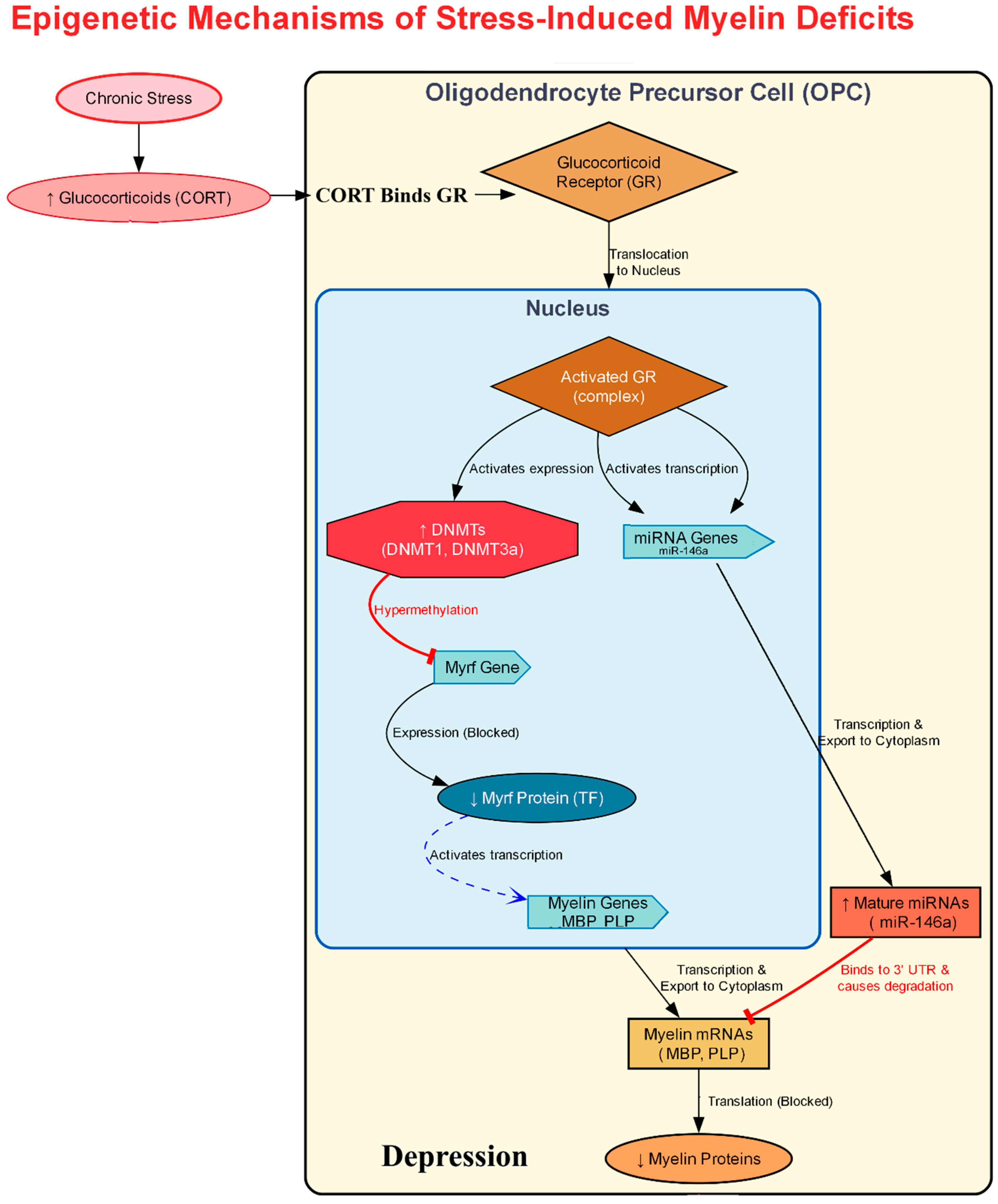 Figure 4. Epigenetic Mechanisms of Stress-Induced Myelin Deficits in Oligodendrocyte Precursor Cells (OPCs). Chronic stress contributes to myelin deficits and depression by initiating two parallel epigenetic pathways in oligodendrocyte precursor cells (OPCs) through increased glucocorticoids (CORT). When CORT binds to its receptor (GR), it triggers both DNA methylation and microRNA regulation. In the first pathway, the activated GR increases the expression of DNA methyltransferases (DNMTs), which hypermethylate and silence the Myelin Regulatory Factor (Myrf) gene. Since Myrf is a master regulator of differentiation, this silencing blocks the transcription of key myelin genes like MBP and PLP. Simultaneously, in the second pathway, the activated GR complex promotes the transcription of microRNAs (miRNAs) like miR-146a. These miRNAs bind to the MBP and PLP mRNAs in the cytoplasm, targeting them for degradation and blocking their translation into protein. Both of these epigenetic mechanisms; transcriptional repression via Myrf hypermethylation and post-transcriptional degradation via miRNAs converge to cause a significant decrease in myelin proteins, leading to the myelin deficits observed in depressive disorders.
