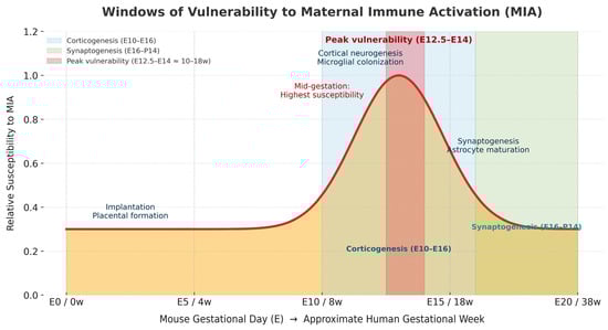 Experimental evidence suggests that the timing of maternal immune activation (MIA) plays a critical role in determining outcomes (Figure 2). In mice, induction of MIA at embryonic day (E) 12.5 reliably provokes cortical malformations and ASD-like behaviors, whereas exposures at later stages (E15.5 or E18.5) do not reproduce such robust phenotypes [24]. This temporal specificity aligns with developmental transitions: at E12.5, cortical progenitors are rapidly proliferating and radial migration has just commenced. Perturbations at this stage can disrupt laminar architecture and produce the “cortical patches” characteristic of MIA models.
