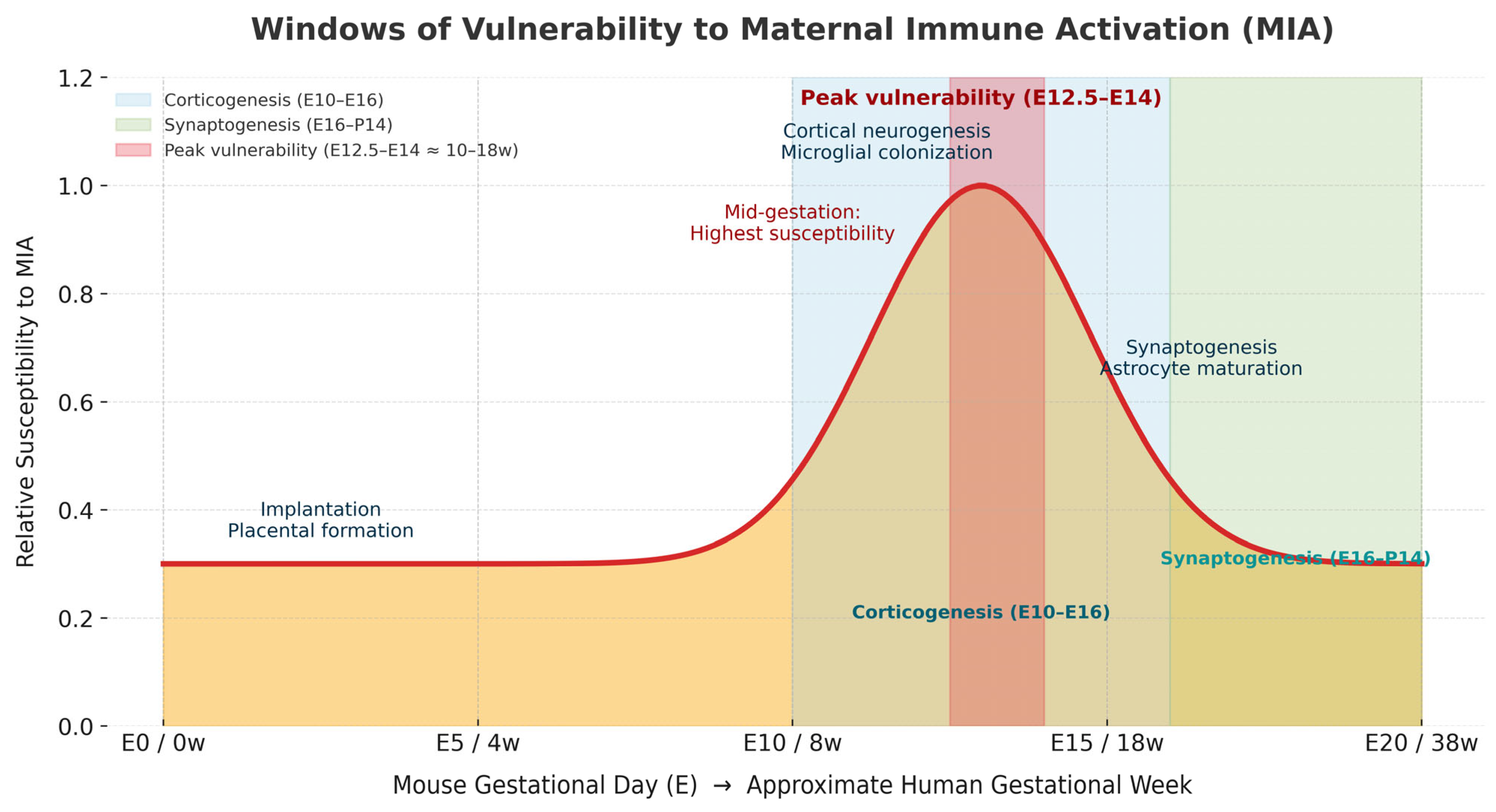 Windows of Vulnerability to Maternal Immune Activation (MIA) Schematic alignment of mouse embryonic development with approximate human gestation. The mid-gestational period (E12.5–E14 in mice; approximately 10–18 weeks in humans) represents the peak window of susceptibility to maternal immune activation (MIA). During this phase, overlapping corticogenesis (E10–E16) and microglial colonization render the fetal brain highly sensitive to IL-17A signaling, which can alter neuronal migration and cortical patterning. Earlier stages correspond to implantation and placental development, whereas later stages (E16–P14) coincide with synaptogenesis and astrocyte maturation, influencing circuit refinement and gliogenesis.