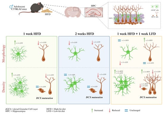 - Yao, X.; Yang, C.; Wang, C.; Li, H.; Zhao, J.; Kang, X.; Liu, Z.; Chen, L.; Chen, X.; Pu, T.; et al. High-Fat Diet Consumption in Adolescence Induces Emotional Behavior Alterations and Hippocampal Neurogenesis Deficits Accompanied by Excessive Microglial Activation. Int. J. Mol. Sci. 2022, 23, 8316. [Google Scholar] [CrossRef]