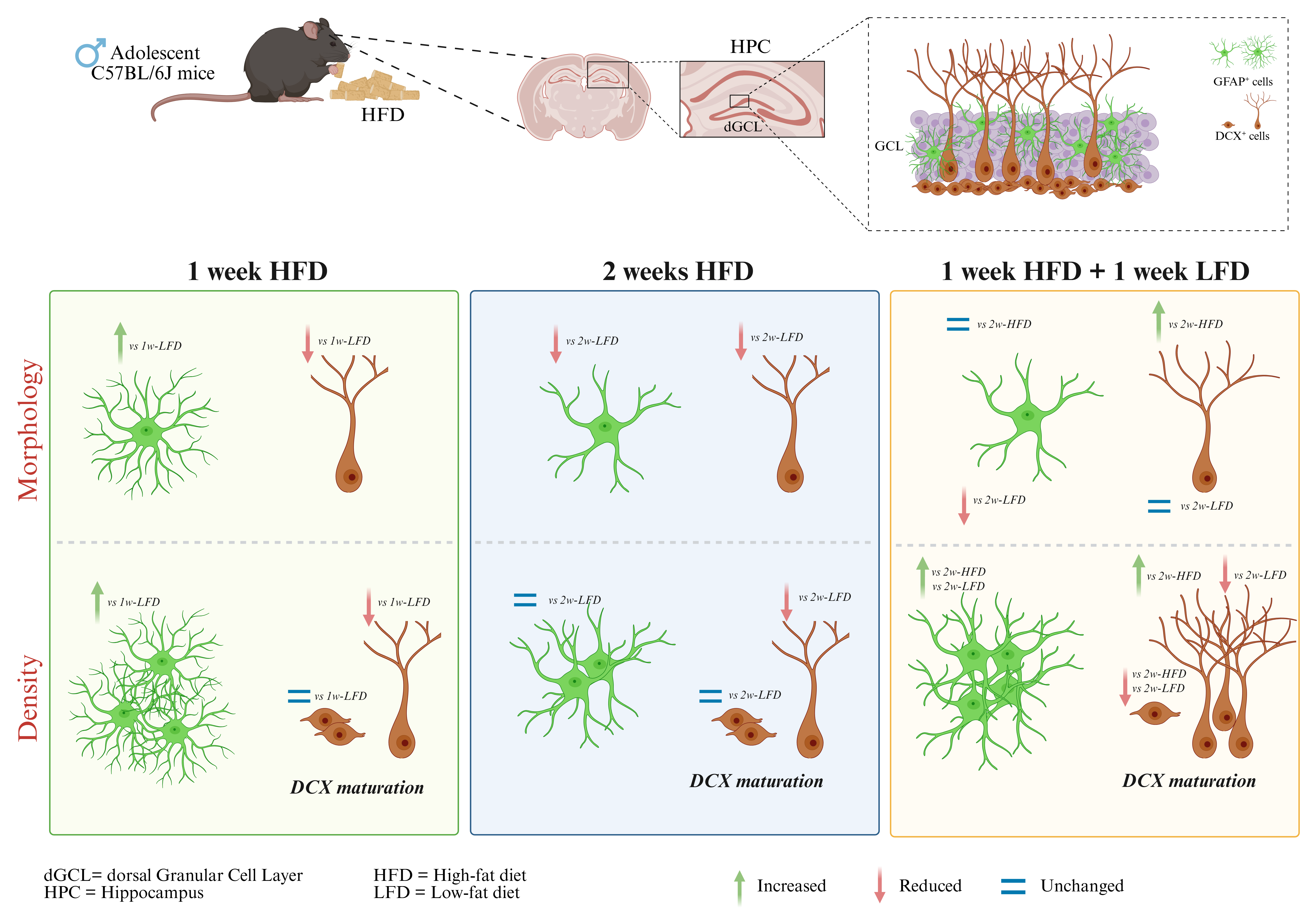 De Cicco G, Chiazza F, Gibin Borzoni G, Pessolano E, Bortolotto V, Grilli M. Complex Effects of Short Periods of High-Fat Diet on GFAP+ Astrocytes and Maturation of DCX+ Cells in the Dorsal Hippocampus of Adolescent Mice. Neuroglia. 2026; 7(1):2. https://doi.org/10.3390/neuroglia7010002