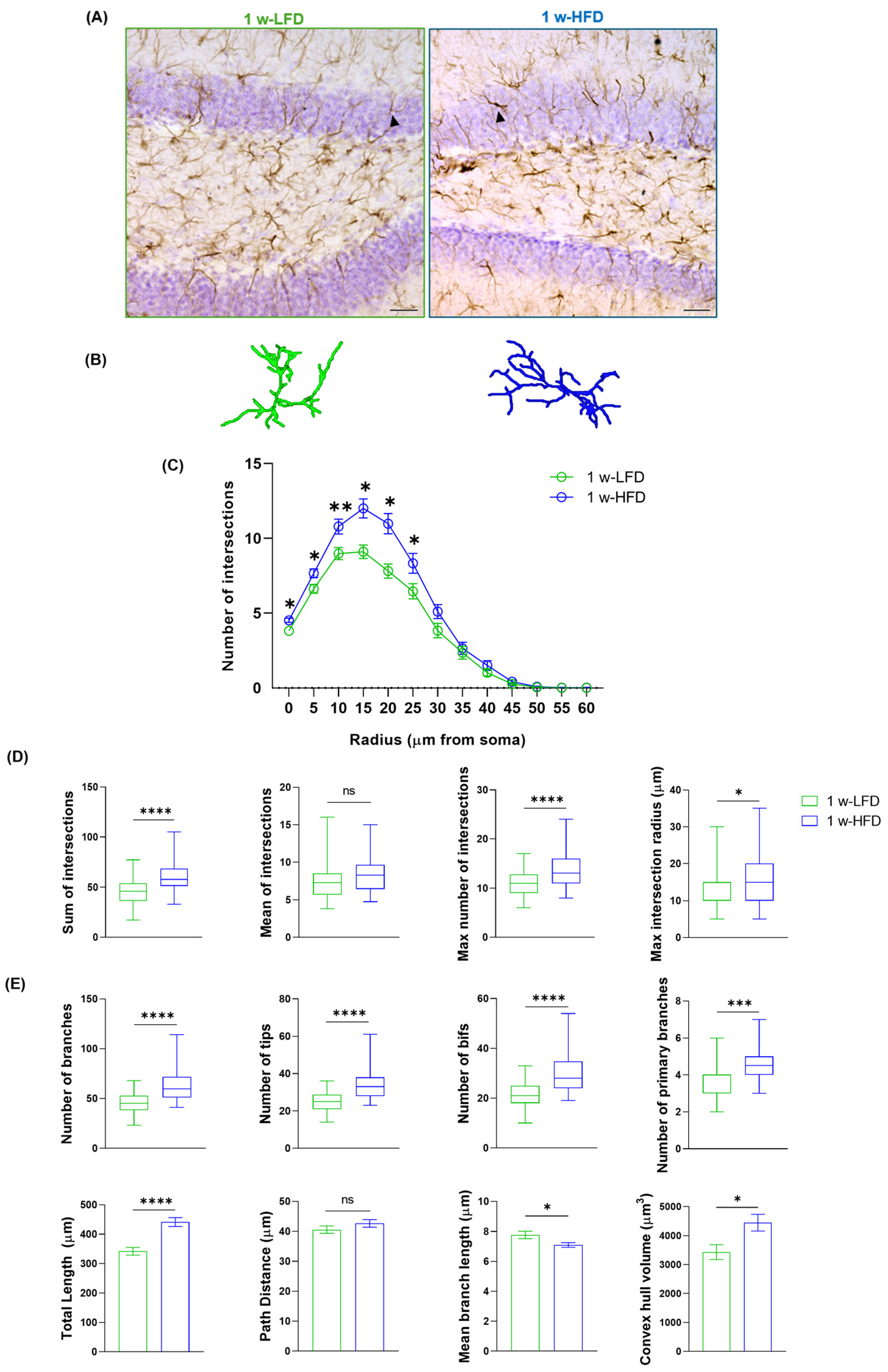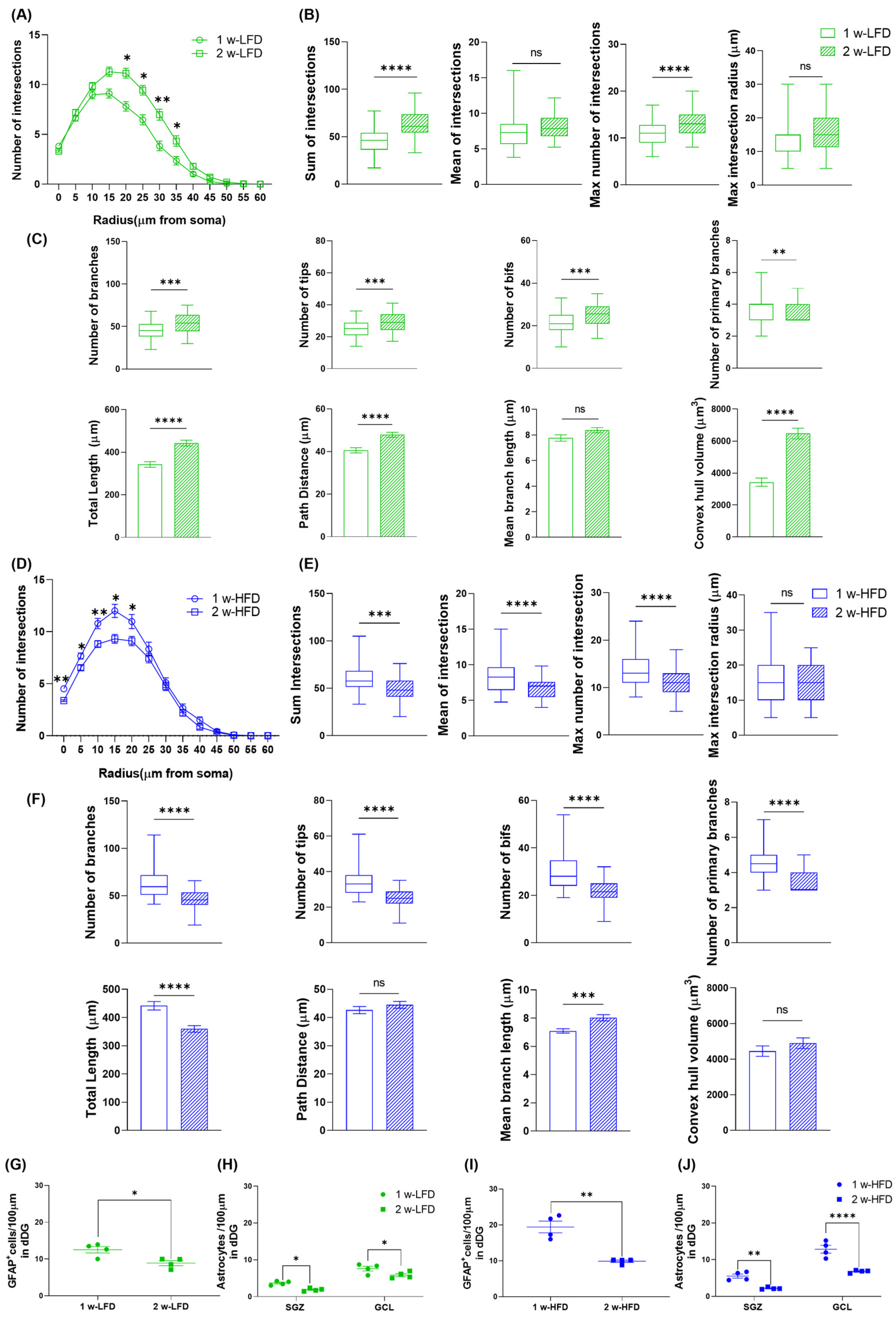 3.1. One-Week HFD Is Associated with Increased Morphological Complexity and Territory Volume of Astrocytes in the Dorsal GCL of Adolescent Mice