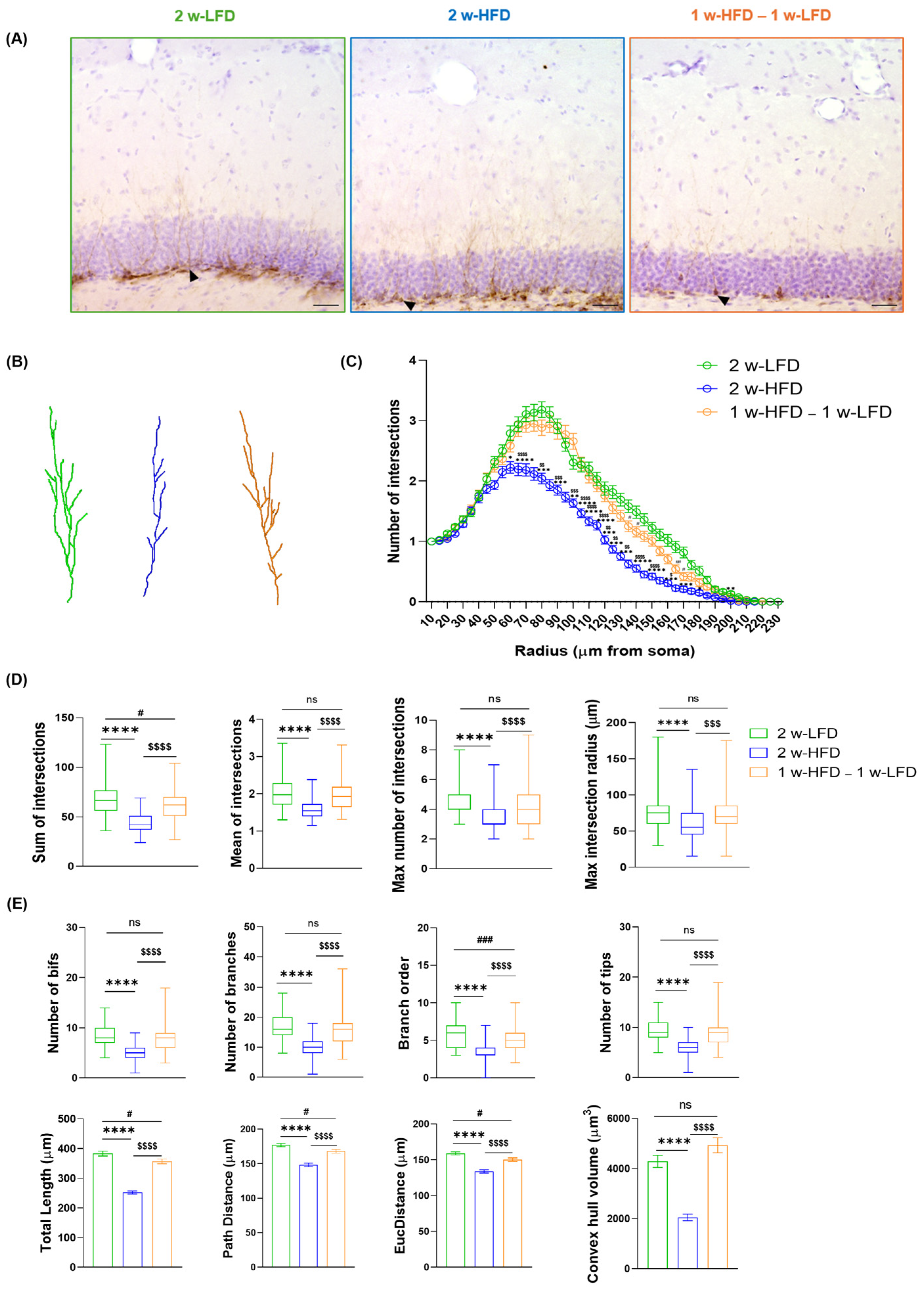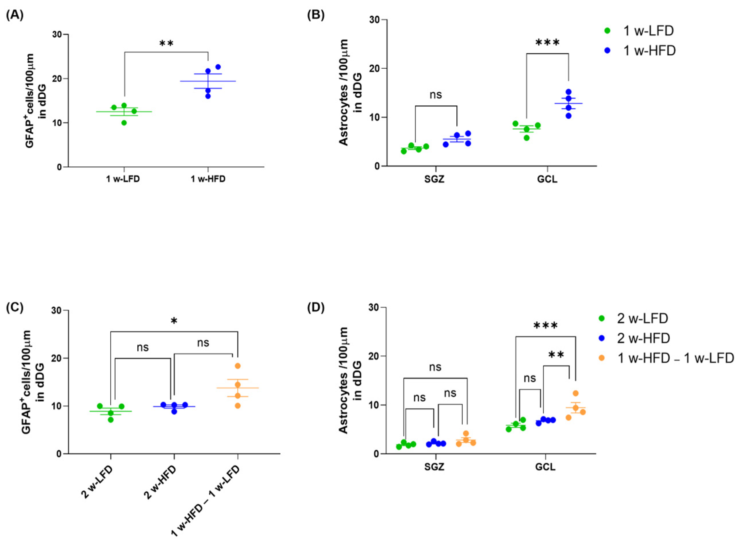 3.2. Two-Week-Long HFD Is Associated with Reduced Astrocyte Complexity and Territory Volume in the Dorsal GCL of Adolescent Mice