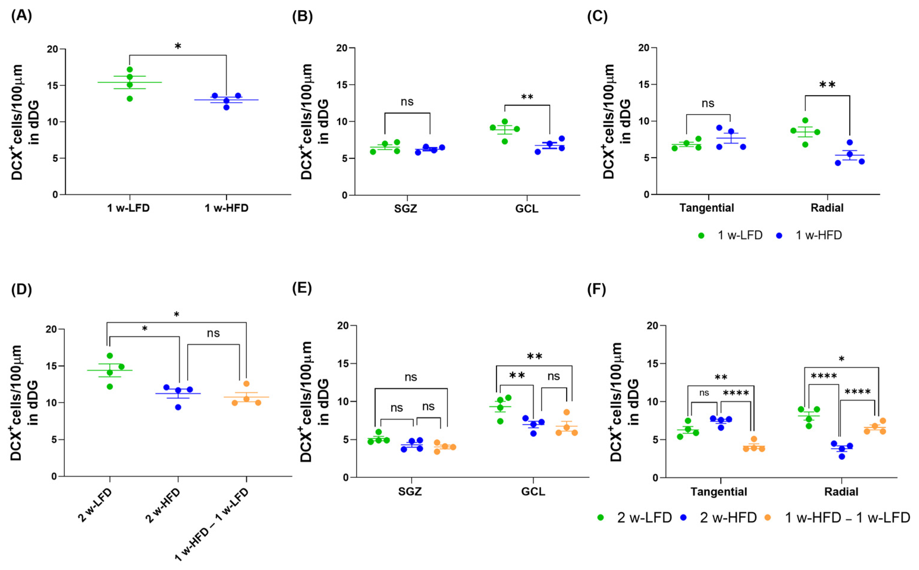 3.5. Short HFD Impairs DCX+ Cell Maturation in the Dorsal GCL of Adolescent Mice