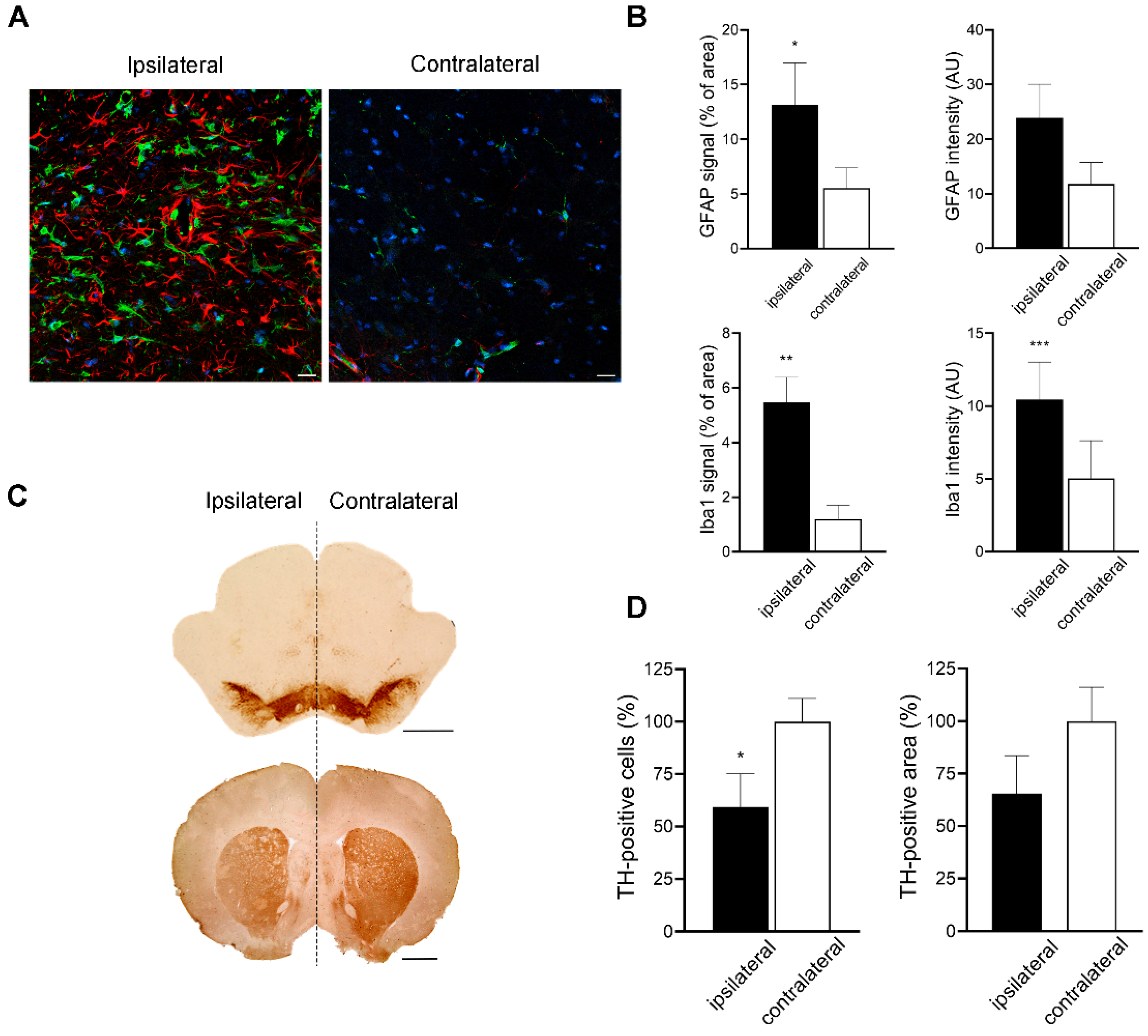 Three days post-unilateral injection of 6-OHDA into the SNpc, the analysis of the tissue microenvironment revealed a significant glial reactivity on the injected side, evidenced by an increased GFAP- and Iba1-covered area and Iba1 intensity compared to the contralateral side (
