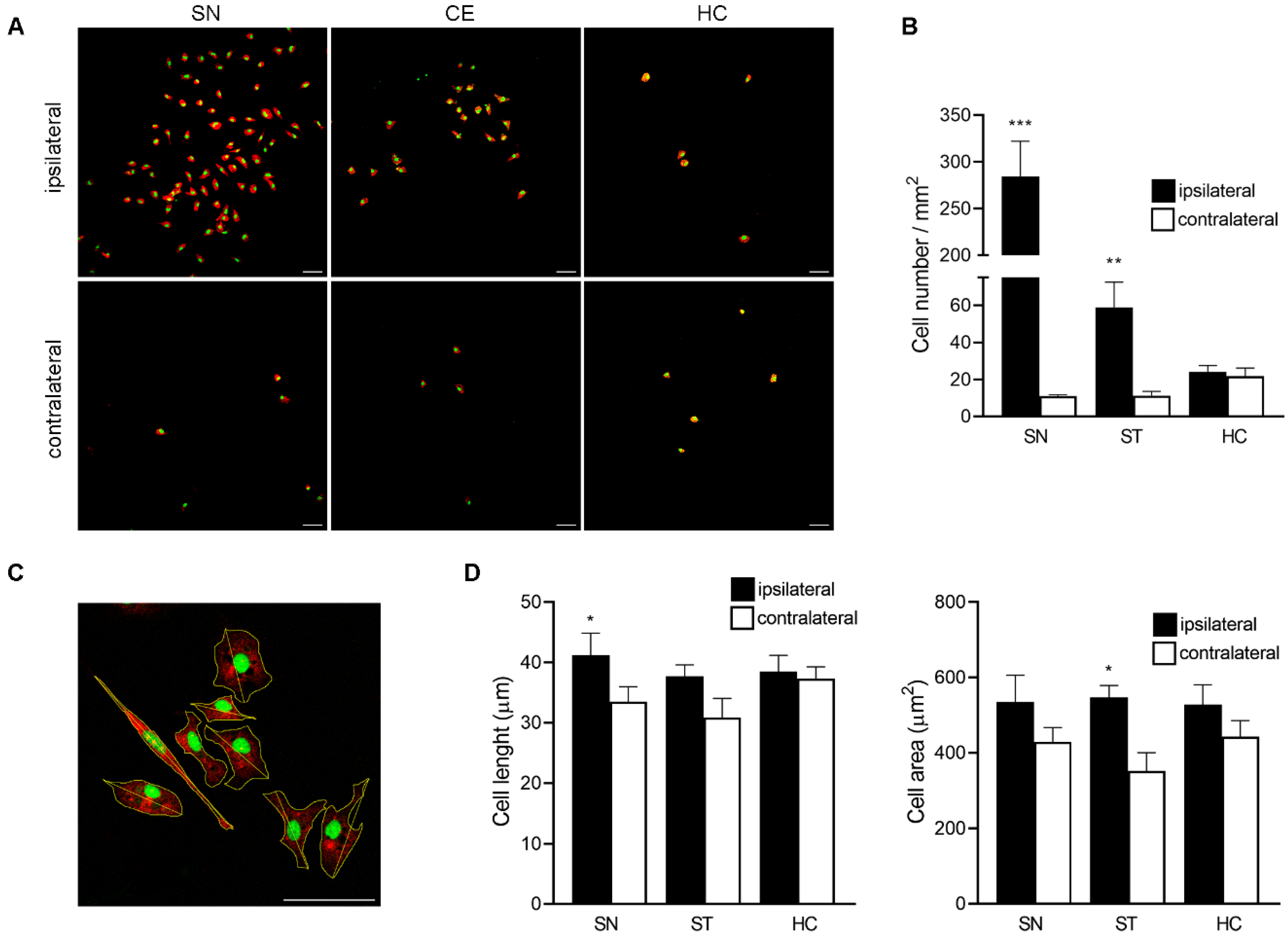 Supplementary Figure S1A). Further characterization revealed that cells derived from the ipsilateral SN displayed a longer major axis, while those from the ipsilateral striatum exhibited an increased cell area compared to their contralateral counterparts (
