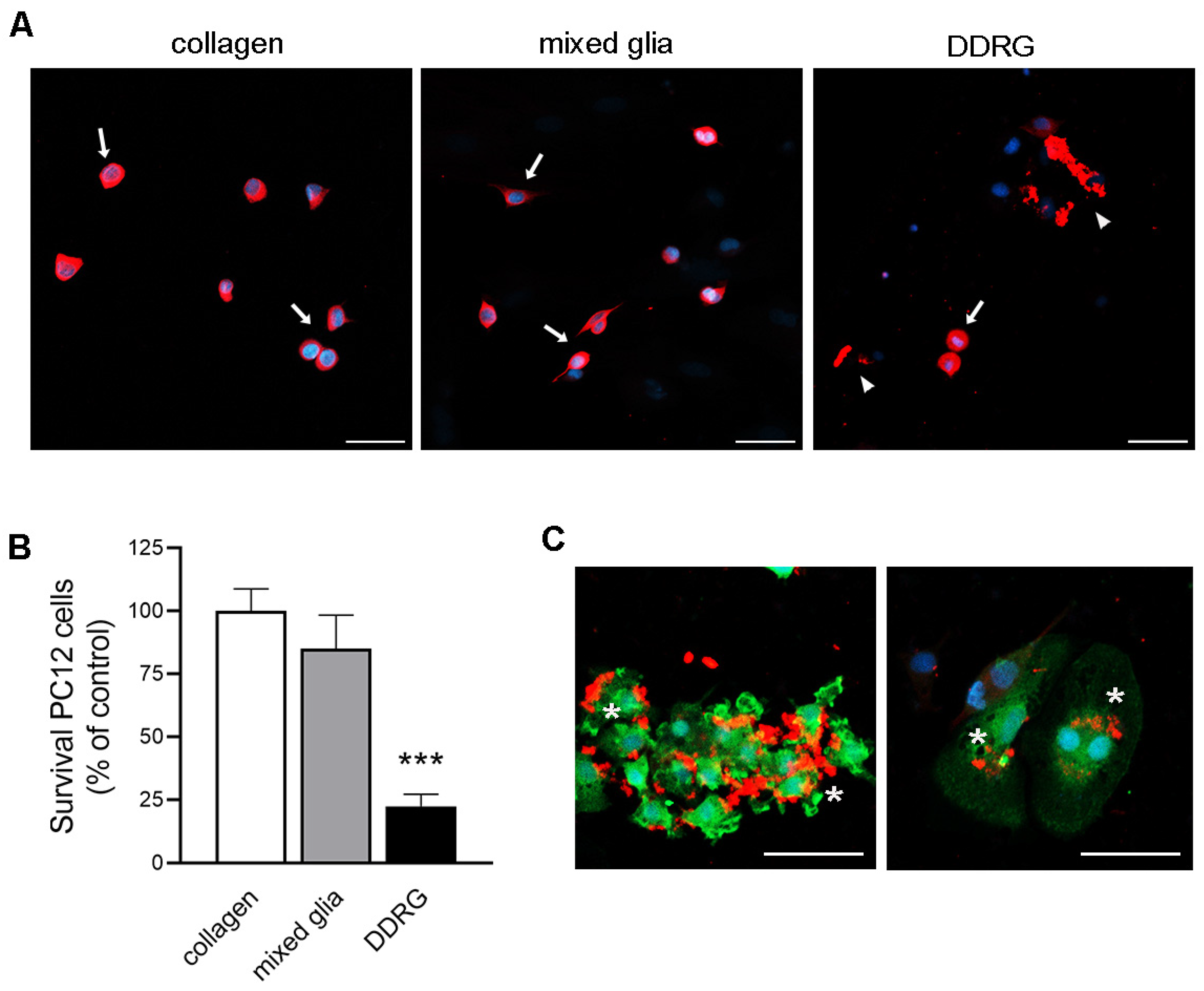 To evaluate whether DDRG cells provide either trophic support or are toxic to neurons, they were co-cultured with PC12 cells. Since glial cultures from the contralateral SNpc yielded very few cells, mixed glial cortical cultures from the cortex were used as controls. The results showed that the number of viable PC12 cells co-cultured with DDRG was significantly lower compared to cultures on the classical substrate collagen or when co-cultured with mixed glial cultures (