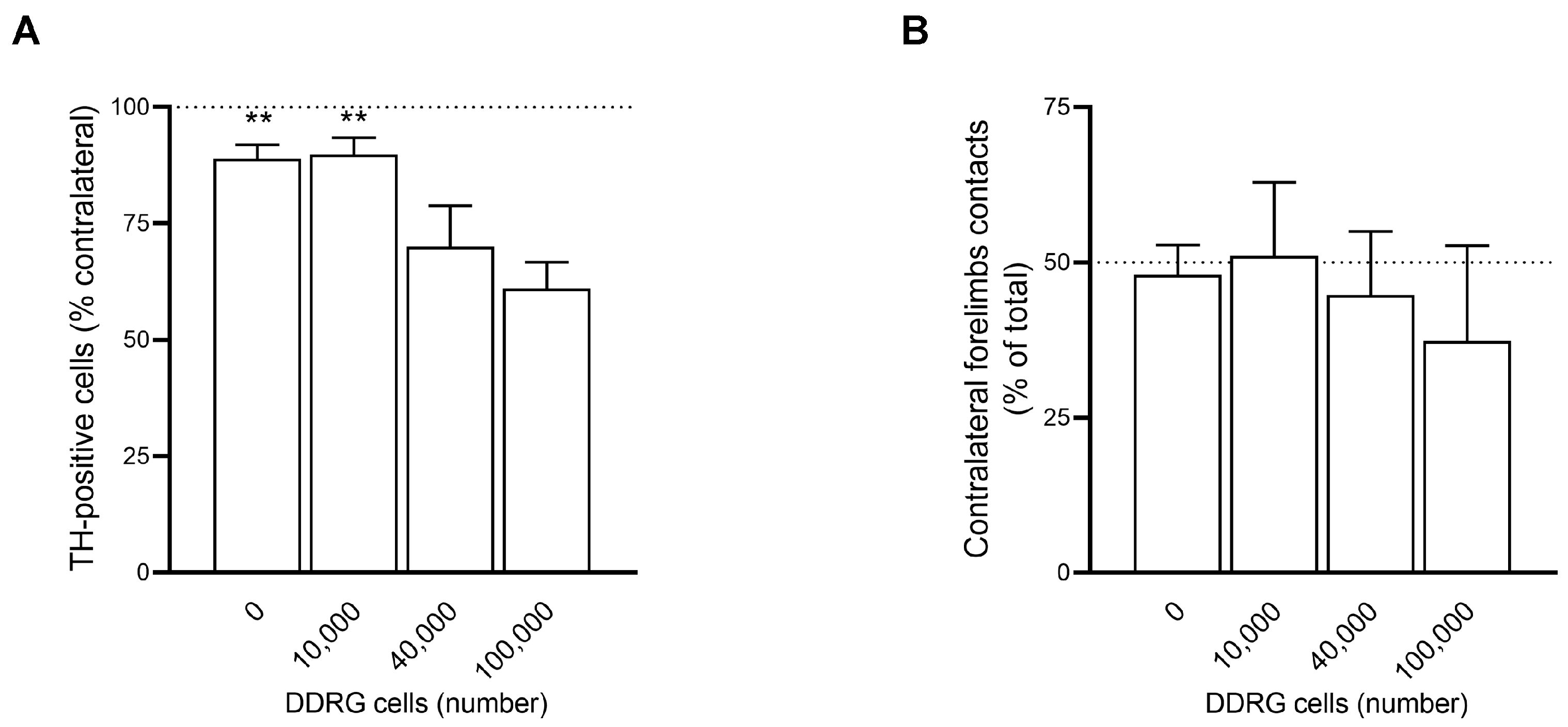 We then evaluated the effect of unilateral DDRG implantation into the SNpc of control animals. Remarkably, degeneration of TH-positive cells in the SNpc increased with the number of transplanted DDRG, and this was accompanied by a corresponding trend toward motor impairment in the cylinder test 30 days after DDRG injection. Implantation of 10,000, 40,000, and 100,000 cells resulted in approximately 10%, 30%, and 40% reductions in TH-positive neurons, and contralateral paw use of about 51%, 45%, and 37%, respectively (