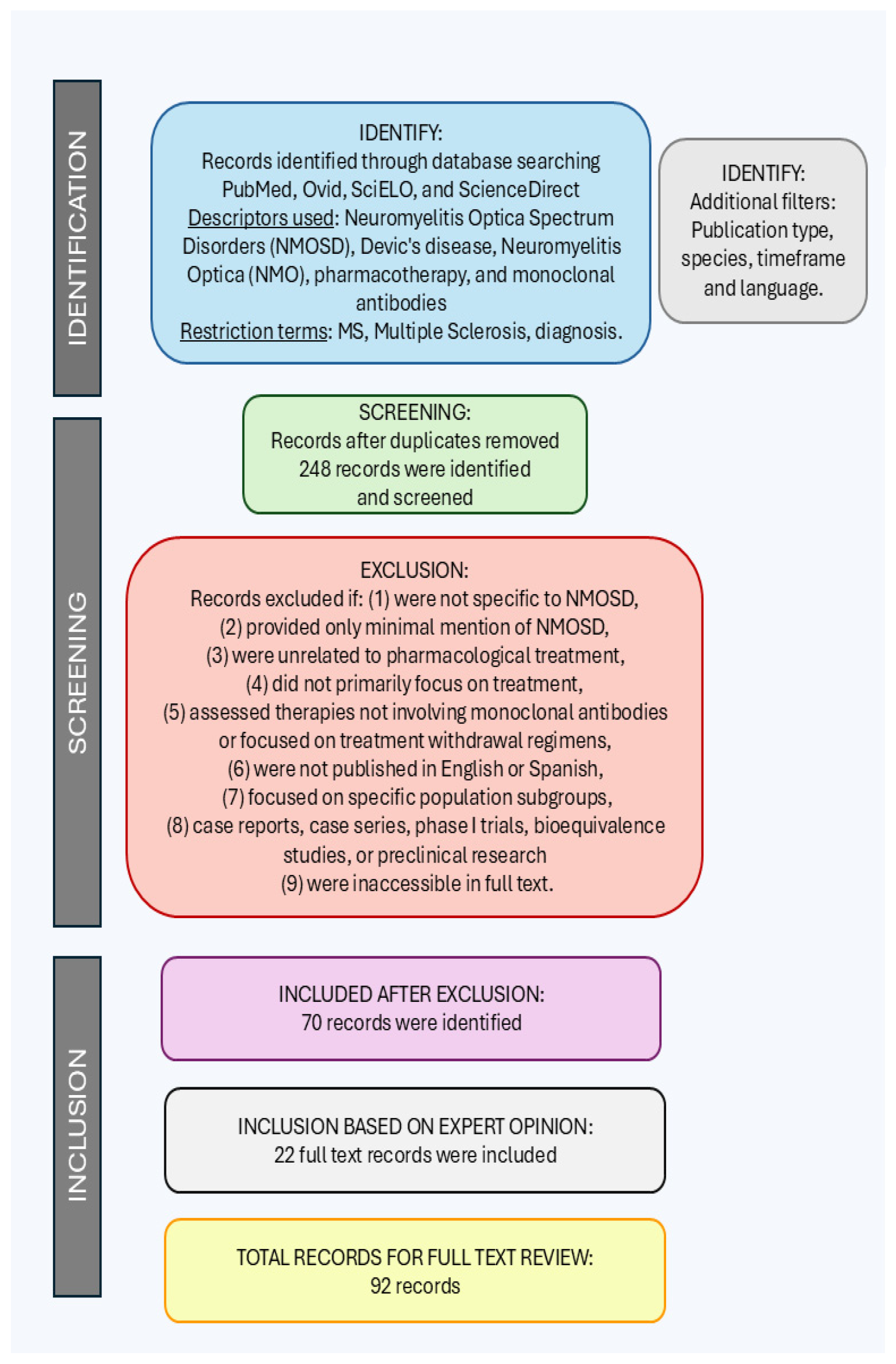Chicago/Turabian StyleSanabria-Castro, Alfredo, José David Villegas-Reyes, Verónica Madrigal-Gamboa, and Roxana Chin-Cheng. 2026. "Monoclonal Antibodies in Neuromyelitis Optica Spectrum Disease: A Systematic Review of Pharmacotherapeutic Alternatives, Current Strategies and Prospective Biological Targets" Neuroglia 7, no. 2: 12. https://doi.org/10.3390/neuroglia7020012