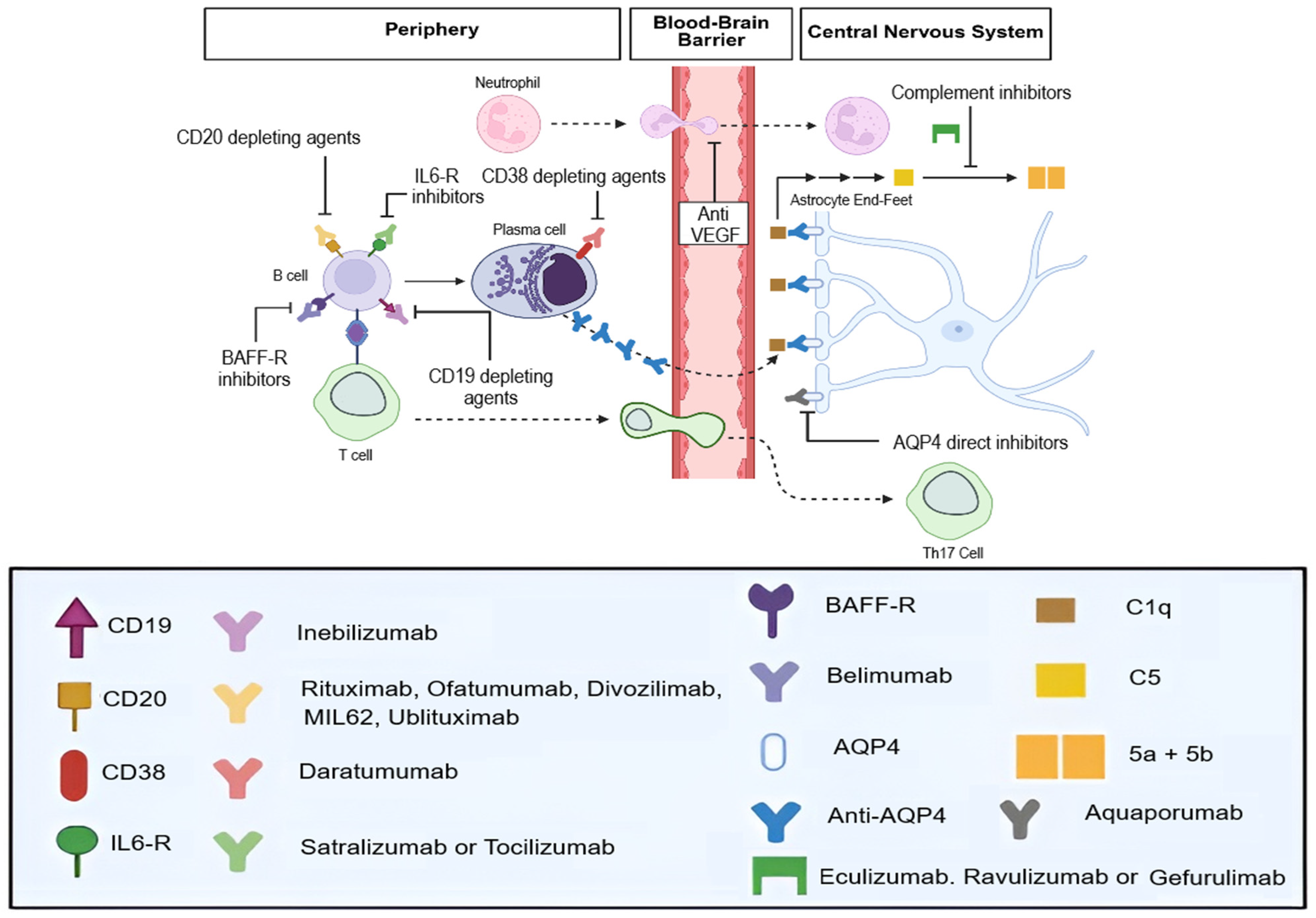 | Acute Relapse | In clinical development | Bevacizumab | Humanized mAb against VEGF reduces BBB disruption | Stabilization of the BBB and reduction of AQP4-IgG and inflammatory cells entry to the CNS. Limited reports available |