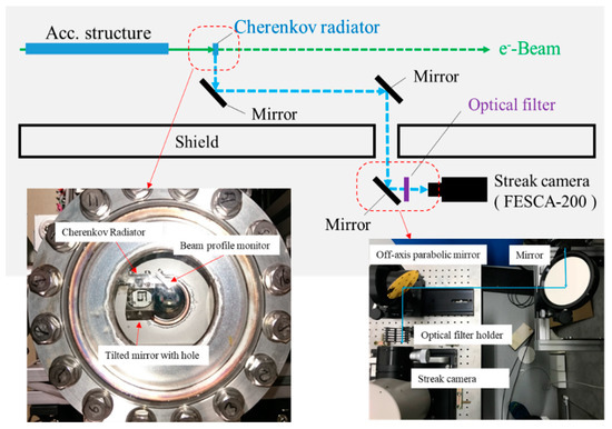 Figure 1 shows a schematic of the transport of CR for bunch length measurement. The generated CR is transported to a streak camera located outside the shield through an optical path length of approximately 10 m. As given by Equation (1), the Cherenkov angle θc is inversely proportional to the particle velocity β and the refractive index n(ω).