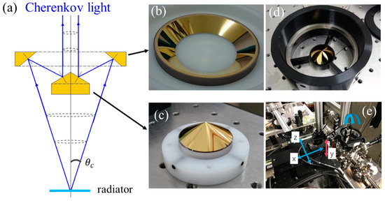 For a silica aerogel with a refractive index of 1.05, the corresponding Cherenkov angle is 18°. By choosing a very low refractive index, the opening angle could be reduced to a rather small value. However, this angle is still too large to transport light over a distance of approximately 10 m. Therefore, we developed a special optical system that converts a diverging light into a parallel ray by combining two mirrors, namely axicon and inverted-axicon mirrors (an AIA mirror system), as shown in Figure 2. The outer diameters of the axicon and inverted-axicon mirrors are 34.2 mm and 100 mm, respectively, and their reflection angles are 58.768° and 49.904°, respectively. The mirror surface is plated with gold, but no protective coating is applied.