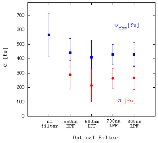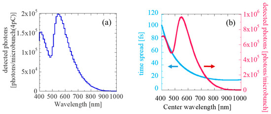 where , dAir, (λ), and nAir(λ) are the thickness of the quartz (viewport), the pass length in air, and the refractive indices of quartz and air, respectively. The chromatic dispersion at each wavelength was evaluated from the frequency distribution of the transit time. The CR intensity at each wavelength was obtained using the Frank–Tamm formula. The transport efficiency of the measurement system was obtained based on the data sheet of each optical element. The total number of photons to be detected can be calculated by multiplying the generated photon number with the transport efficiency including the detection efficiency of the streak camera. Figure 3a shows the estimated number of photons per one microbunch of 4 pC to be detected by the streak camera as a function of the CR wavelength. The dip seen in the number of photons near 500 nm is due to the reflection characteristics of the mirror used in the transport line. Based on the estimated number of photons, the temporal spread of the CR pulse was evaluated for each optical filter, namely a 550 ± 25 nm bandpass filter (BPF) and a longpass filter (LPF) with cut-on wavelengths of 600, 700, and 800 nm, to be installed in the transmission line, as listed in Table 3. If a 550 nm BPF is employed to restrict the wavelength region, the expected time spread is 39 fs, as shown in Figure 3b, whereas the estimated number of photons to be detected is approximately 1 million. According to previous measurements based on the OTR, the estimated σCD and the number of photons were 240 fs and 6.6 × 104, respectively. Thus, despite the fact that the number of photons can be increased to 15 times that of the previous OTR measurements, the time spread is expected to be significantly suppressed to one sixth of that.