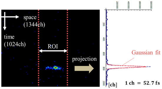Streak image of the CR on the phosphor screen. The width of the temporal direction is derived by Gaussian fitting to the projected profile within a region of interest (ROI) of 400 pixels.
