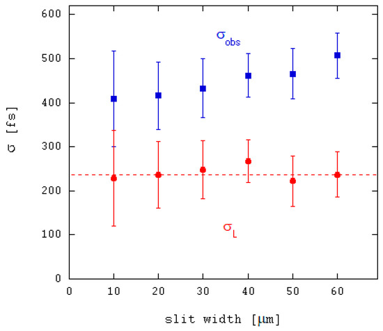 As listed in Table 2, when a higher time resolution is required for the measurement, it is necessary to narrow the width of the vertical slit. Figure 5 shows the effect of the slit width on the measured bunch length. A 700 nm LPF was used for the measurement. As mentioned above, the actual bunch length was obtained by subtracting the time spread due to the contributions, given in Equation (2), from the observed time spread. The data of the various slit widths were averaged, and the bunch length was finally obtained as 238 ± 68 fs.