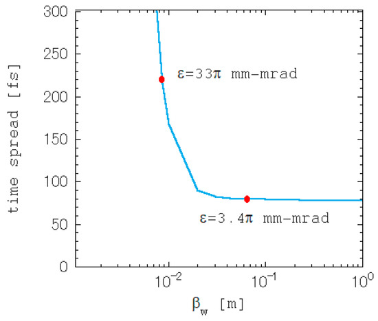 To investigate the reason currently limiting the resolution, the effect of beam focusing on the measured bunch length was obtained using the 3D ray trace calculation. In this analysis, the beam size was fixed to 70 µm at the radiator position. Moreover, the emittances in the horizontal and vertical planes were assumed the same. Thus, if the beam has a larger emittance, it corresponds to a lower beta function, implying that the beam has a greater angular divergence. Figure 7 shows the expected variation in the time spread for the beta function at the radiator position.