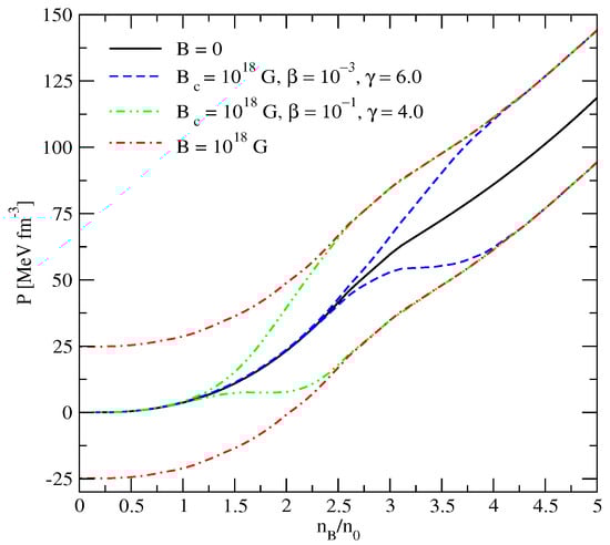 From the figure, it is evident that, when the field is below G, both and differ very little from the matter pressure in the absence of a magnetic field. Thus, the effect of the magnetic field for the SQM is not significant below G. With the increase in the field, increases, whereas decreases.
