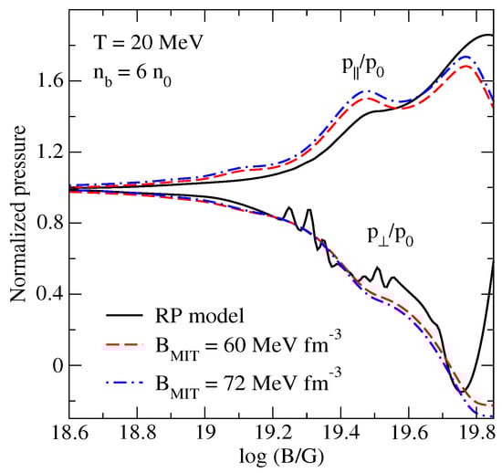 Variation in the normalized pressure in parallel and perpendicular directions to the magnetic field with the strength of the magnetic field at and MeV []. The solid curve is for the model under consideration, the dashed and the dash-dotted curves for the MIT bag model with values of bag constants 60 and 72 MeV fm, respectively. The upper curves correspond to the parallel pressure, the lower curves to the perpendicular pressure.