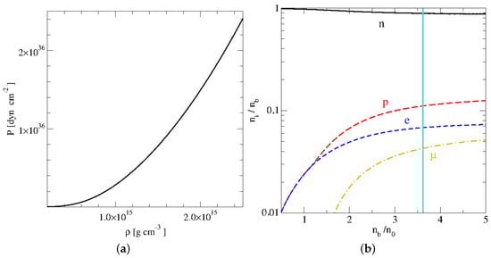 (a) Zero-temperature equation of state. (b) Variation in particle abundances on the normalized baryon density. The vertical line indicates the approximate Urca threshold.
