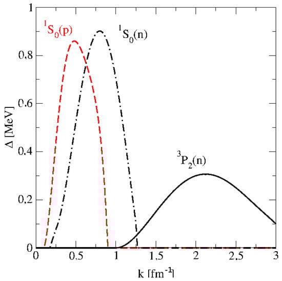 In the crust of a compact star, low density neutrons pair in the channel. Towards the center, as the density increases, the S-wave interaction becomes repulsive and the neutron pairing in the channel becomes important. However, protons are much less abundant throughout the core and hence proton pairing in the channel is admissible inside the core. Figure 4 shows variation in gap energies for the dominant channels with Fermi momenta of the respective particles relevant for the interior of the neutron star adopted from [,,].