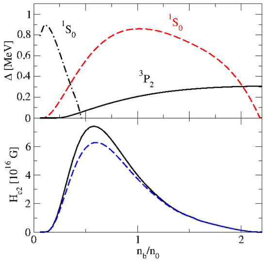 where and are the proton and neutron condensate wave-functions, is the GL functional for neutron superfluid, is the proton mass, and , being the critical temperature of superconducting phase transition of protons. Here, , b, and are the constants. For detailed discussion, see []. Then, the upper critical field can be calculated to the linear order of as []