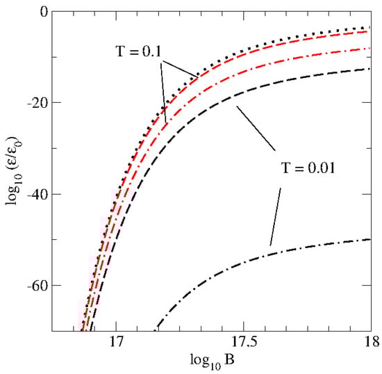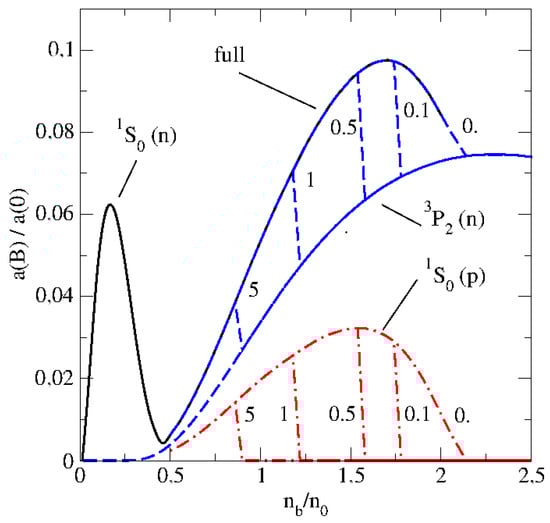 However, the presence of a strong magnetic field unpairs the proton superconductor if the field strength is larger than the local upper critical field []. In that case, the suppression of the Urca process due to the proton pairing gap is absent and the suppression for the pairing gap is only due to neutron pairing. This effect is shown by the dashed curves in the same figure (Figure 6). The suppression strongly deviates from that expected in the case of superconducting protons as the gap for neutron pairing in the P-wave channel is smaller than the one in the S channel for protons (see Figure 5).