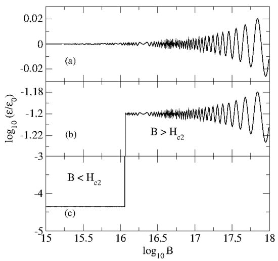 In the allowed region, the effect of magnetic field is the introduction of de-Haas–van Alfven type oscillations in the emissivity around its value in the zero B-field limit, as expected [,,]. This is shown in the panel a of Figure 7, which is the case for normal matter. In the case of paired nucleons the emissivity is suppressed due to pairing gaps of both protons and neutrons in the low field regime, as shown by panel c of Figure 7. When the field crosses the value of the local upper critical field, the protons are unpaired and the suppression due to proton pairing disappears leading to enhancement in emissivity, as shown by the panel b of the same Figure 7. Here it should be noted that a sharp jump seen in the emissivity is in fact a smooth transition because, in the range of fields , the superconductor is in the mixed (flux-tube) state. The emissivity in the mixed state has not been studied by us, so we present only the asymptotic results for and .
