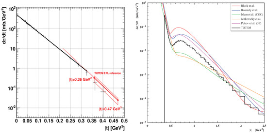 The differential cross section of elastic scattering of protons has a specific dependence on the transferred momentum t which evolves with energy s as measured by the collaboration TOTEM [10,11,12]. In Figure 1 and Figure 2 it is shown for two energies of LHC.