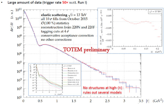 - Antchev, G.; D’Orazio, A.; Barrera, C.B. Evidence for non-exponential elastic proton-proton differential cross-section at low |t| and = 8 TeV by TOTEM. Nucl. Phys. B 2015, 899, 527. [Google Scholar] [CrossRef]