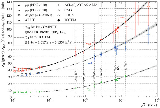 - Antchev, G.; D’Orazio, A.; Barrera, C.B. Luminosity-independent measurement of the proton-proton total cross section at = 8 TeV. Phys. Rev. Lett. 2013, 111, 012001. [Google Scholar] [CrossRef]