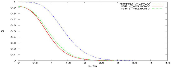 Quite special feature of at ISR energies was noticed in [31] where genuine experimental data were used. At its tail of large impact parameters from 2 fm to 2.5 fm a slight bump was observed. No bump was obtained in [38] where some interpolation of the data was used. The results in Figure 7 and Figure 8 do not show any indication on such a bump. The corresponding values of fm are similar to those in [31].