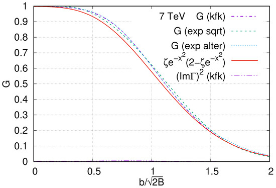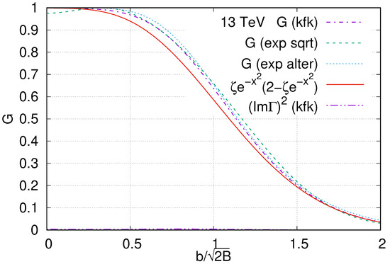 Another shape of the interaction region of the BEL-type follows from the so-called kfk-model [36]. This phenomenological model exploits some QCD inspired ideas and predicts both real and imaginary parts of the amplitude using numerous parameters derived from precise fits of measured cross sections. According to it, the real part becomes zero inside the diffraction cone region while the imaginary part possesses zero near the minimum of the differential cross section (it is seen in Figure 1). Its value at the minimum is filled by a small negative real part. The imaginary part becomes also negative at larger transferred momenta. It reminds the second variant. Therefore has no dip at the center . It is also demonstrated in Figure 7 and Figure 8. Some analysis of the kfk-model showing its “anatomy” was done in Ref. [2]. It is possible to verify our assumption about the smallness of the real part of the amplitude for this model. The real part of the amplitude has been computed at 7 and 13 TeV. Its contribution to the shape of in Equation (7) happens to be extremely small (within the limits of experimental accuracy) and can be neglected (see Figure 8). The model predicts the BEL-shape of the interaction region even at asymptotically high energies.