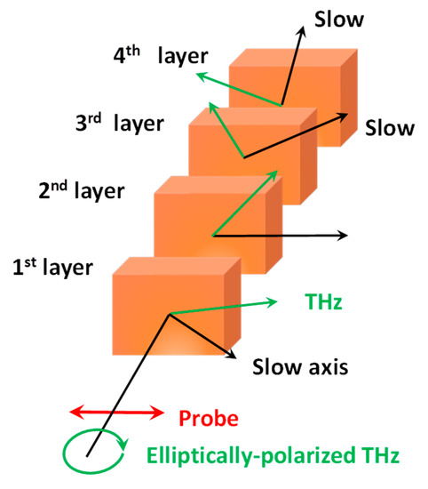 To interpret the detected EO signal for elliptically-polarized terahertz waves, we utilized the multilayer model [98]. Figure 1 shows a schematic illustration of the multilayer model. In this model, we divide the EO crystal with thickness into layers, where the number of layers is much larger than unity and the thickness of each layer is much smaller than the coherence length of the EO crystal. Therefore, we can consider that, in each extremely thin layer, the velocity-matching condition between the terahertz wave and probe pulse is satisfied. Because of the velocity matching, the probe pulse senses a constant terahertz E-field-induced birefringence during the propagation through a single layer. At the boundary between the n-th and (n + 1)-th layers, we add the effects of the velocity mismatch, because the probe pulse senses a terahertz E-field-induced birefringence that is different from that in the previous layer. Although there is refractive index change between the two layers, we neglect the reflections at the boundaries, because the difference of the refractive index between two adjacent layers is small. Strictly speaking, if the probe pulse has a finite pulse width (as described by the intensity profile ), it simultaneously senses successive changes of the terahertz E-field-induced birefringence within its pulse width. In the present multilayer model, we neglect such a complicated situation and suppose that the probe pulse is a delta-function-like ultra-short pulse, i.e., , where is the group velocity of the probe pulse.