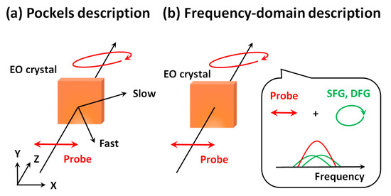 Figure 2 shows the difference between the Pockels effect (described in the previous section) and frequency-domain descriptions. The latter was initially proposed by Gallot and Grischkowsky [83] for interpretation of the results in the case of linearly-polarized terahertz pulses. In terms of the Pockels effect (Figure 2a), the polarization direction of the linearly-polarized probe pulse rotates inside the EO crystal because of the terahertz E-field-induced birefringence. On the other hand, in the frequency-domain description (Figure 2b), the polarization of the probe pulse (whose Fourier component is denoted by ) stays unchanged inside the EO crystal. Instead of the terahertz E-field-induced birefringence, we consider the additional frequency mixing fields, i.e., the sum frequency generation (SFG) field and difference frequency generation (DFG) field, caused by the nonlinear polarization field that is induced by the terahertz and probe pulses. These fields are added to the probe pulse and thus result in a change of the measured polarization direction. We denote the X- and Y-components of the summed SFG and DFG fields by and , respectively. Subsequently, the relation is satisfied where is the angular frequency of terahertz field. We assume that the frequency bandwidth of the probe pulse is larger than and therefore the frequency components of the probe, SFG, and DFG pulses overlap with each other, as shown in the inset of Figure 2. The Jones vector of the total E-field, including the probe, SFG, and DFG fields at angular frequency , can be described by