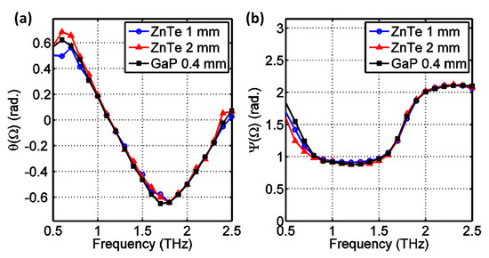 Equation (17) is the key of the terahertz polarization spectroscopy based on PS-EO sampling, because it shows that the parameter is independent of , and thus can be derived from the simple division of the Fourier transformed PS-EO signals. As mentioned above, the temporal profiles of the PS-EO signals differ from the original time-domain profile of the elliptically-polarized terahertz pulse due to . Because depends on many complicated effects such as the finite probe-pulse width, degree of phase mismatching, absorption coefficient, and frequency-dependent nonlinear optical coefficient, the interpretation of the time-domain waveform is rather difficult. On the other hand, the polarization state of each frequency component is independent of , and thus it can be simply derived from Equation (17). Section 3.1 provides the experimental demonstration of the polarization spectroscopy based on this finding.