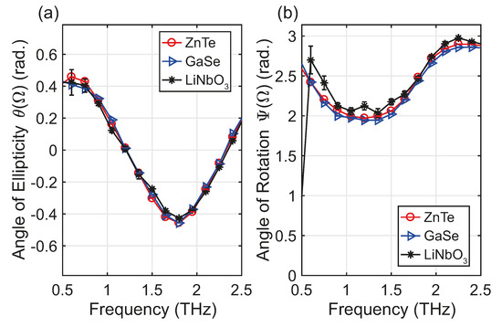 We prepare six EO crystals: two <110>-oriented ZnTe crystals with thicknesses of 1 and 2 mm, a <110>-oriented GaP crystal with a thickness of 0.4 mm [93], a <111>-oriented ZnTe crystal with a thickness of 1 mm, a 0.1-mm-thick c-cut GaSe crystal, and a 0.5-mm-thick c-cut LiNbO3 crystal [94]. For each of these six EO crystals, the auxiliary angle of the ellipticity and the angle of rotation of the elliptically-polarized terahertz pulse are plotted as a function of frequency in either Figure 3a,b or Figure 4a,b. In each of these figures, the obtained data points almost coincide with each other. The obtained spectra that are shown in Figure 3a and Figure 4a are well explained by the frequency-dependent polarization response of the monochromatic QWP. Since the used QWP is designed for 496 μm (~0.6 THz), the polarization state at 0.6 THz should be circularly-polarized, i.e., . In addition, the QWP is expected to act as half, three-forth, and full waveplate at 1.2, 1.8, and 2.4 THz, respectively. Thus, the polarization state should become linearly-polarized, circularly-polarized, and again linearly-polarized at ~1.2, ~1.8, and 2.4 THz, respectively. The experimental results that are shown in Figure 3a and Figure 4a are in good agreement with this predicted frequency dependence of the ellipticity angle. In addition, the frequency dependence of is also well explained by the frequency-dependent polarization response of the QWP as well as that of . These consistent results strongly support our conclusion that the polarization state of the terahertz wave can be obtained precisely with any of the chosen EO crystals. The difference in and between Figure 3 and Figure 4 is due to different experimental conditions between Refs. [93,94]. A more detailed polarization analysis using Stokes parameters and the Poincaré sphere representation is provided in our previous work [93].