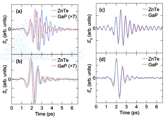 Next, we measure the EO signals and by using the two EO crystals. Figure 5a,b show the E-field time traces that were obtained with the ZnTe crystal (blue data) and the GaP crystal (red data). The magnitudes of and for the GaP crystal are magnified by a factor of 7 for clarity. Since we measure the same elliptically-polarized terahertz pulse, we can infer that the difference in the measured time-domain waveforms is due to the difference in the of the two EO crystals. The difference in the magnitude is attributed to the difference in . In the ZnTe and GaP crystals, the difference in is mainly governed by the difference in , i.e., in ZnTe and in GaP. On the other hand, the time-domain signal measured by the GaP crystal arrives earlier than that measured by the ZnTe crystal. This fact can be explained by the difference in , which is determined by the crystal thickness and the refractive index.
