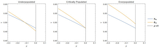 Contours of constant particle number and energy density at equilibrium. The values of the equilibrium parameters T and are found where the lines intersect. In the critically populated case, the intersection occurs at the maximum possible value of . In the overpopulated case, no real solution for exists and a condensate is necessary to contain the excess particles.