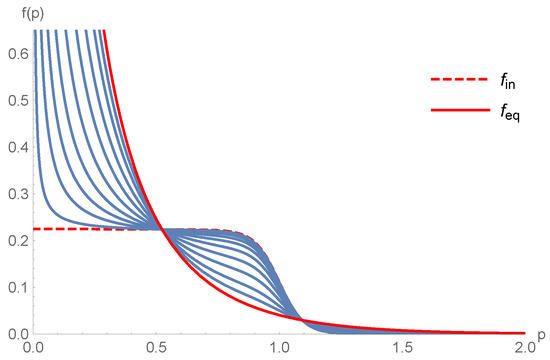 Evolution of the initial condition using the Relaxation Time Approximation. The relaxation time parameter is taken to be 40 in order to match the Fokker-Planck timescale; the intermediate distribution functions shown are for times .