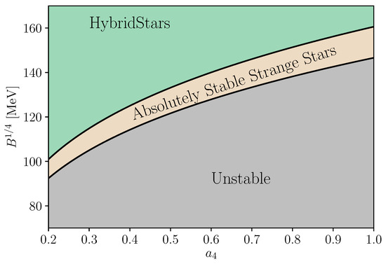- The quadratic coefficient accounts for the contribution of the strange quark mass and color superconductivity. The value of this parameter is given by , where MeV is the strange quark mass and MeV is the energy gap between free and Cooper pairs of quarks [38,40,42].