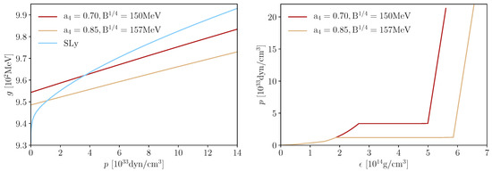 We start writing g as a function of p for both phases. This is straightforward for the SQM, solving Equation (10) for g, one obtains